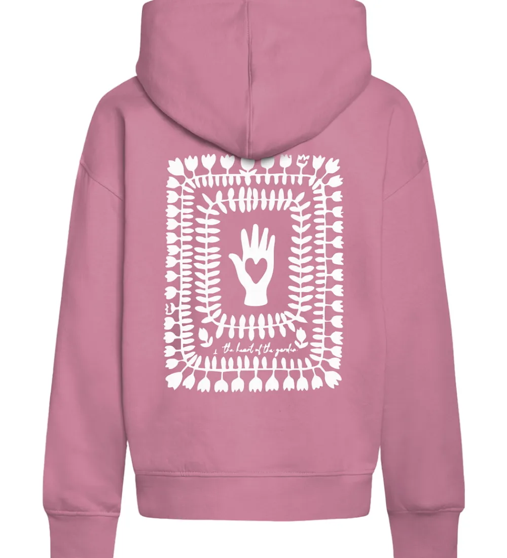 Flot Grunt hættetrøje i lyserød sweat, og på ryggen er der et stort, hvidt print. Grunt hættetrøjen har en klassisk kængurulomme foran og en rummelig hætte. Den har brede ribkanter, der giver en god pasform, og på indersiden er der blødt, børstet bomuld.