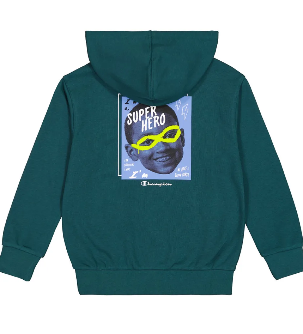 Frisk Champion hættetrøje i en dyb grønblå farve med et stort superhelt-print på fronten.