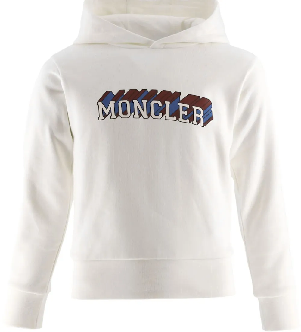 Stilfuld hættetrøje fra Moncler i hvidt sweat. Moncler hættetrøjen har et markant logoprint på fronten i en kombination af blå, rød og hvid, der giver et moderne udtryk. Den bløde struktur af hættetrøjen sikrer en god pasform, mens ribkanter ved ærmerne og livet fuldender designet. Hættetrøjen har blødt, børstet bomuld på indersiden, og hætten er foret med bomuldsjersey.