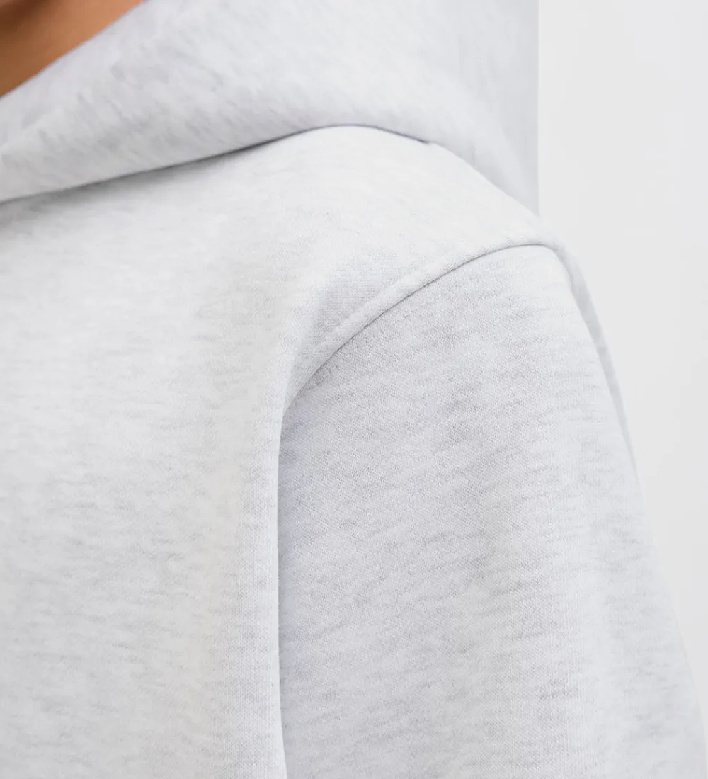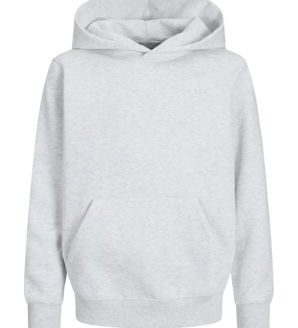 Flot Jack & Jones hættetrøje i gråmeleret. Jack & Jones hættetrøjen er lavet i en kraftig kvalitet med en blød hætte og lange ærmer. Den har brede ribkanter i ærme- og taljeåbning. Indvendigt er der blødt, børstet bomuld.