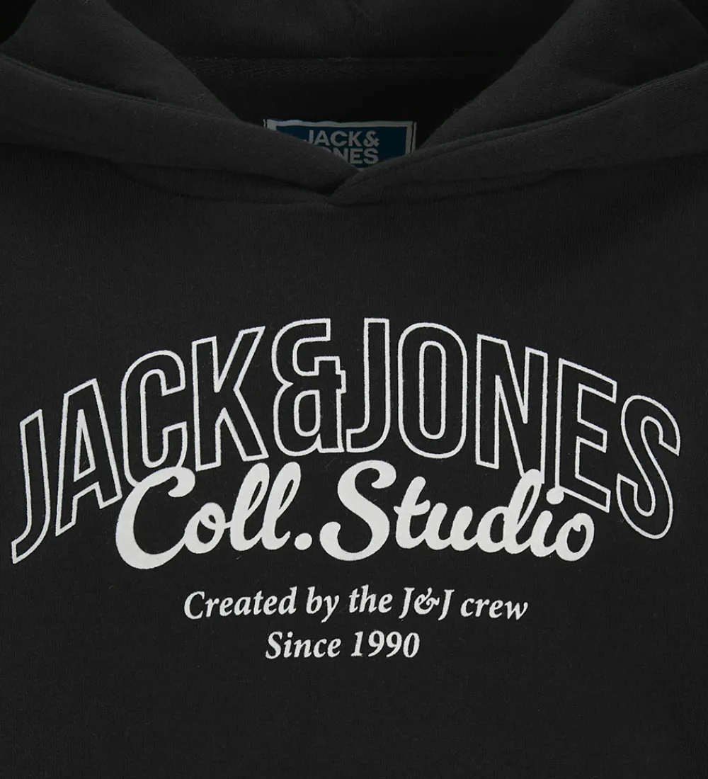 Stilfuld Jack & Jones hættetrøje i klassisk sort med et iøjnefaldende, hvidt tryk på brystet. Hættetrøjen har en praktisk og behagelig hætte, der giver ekstra varme og beskyttelse. Ribkanter ved ærmerne og i livet sikrer et godt fit.