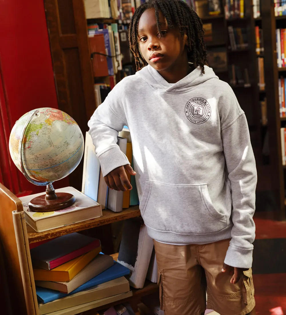 Elegant hættetrøje fra Abercrombie & Fitch i lysegråmeleret sweat, og på ryggen er der et stort print i bordeaux. Hættetrøjen har en fast hætte med et bomuldsfor, og den har brede ribkanter. Ved ærmerne er der et lille hul til tommelfingeren. Fortil sidder der en stor kængurulomme, og hættetrøjen har blødt, børstet bomuld på indersiden.
