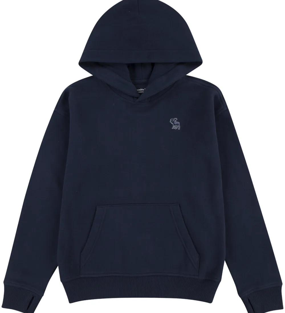 Flot hættetrøje fra Abercrombie & Fitch i ensfarvet navy sweat. Hættetrøjen har en fast hætte med et bomuldsfor, og den har brede ribkanter. Ved ærmerne er der et lille hul til tommelfingeren. Fortil sidder der en stor kængurulomme, og hættetrøjen har blødt, børstet bomuld på indersiden.