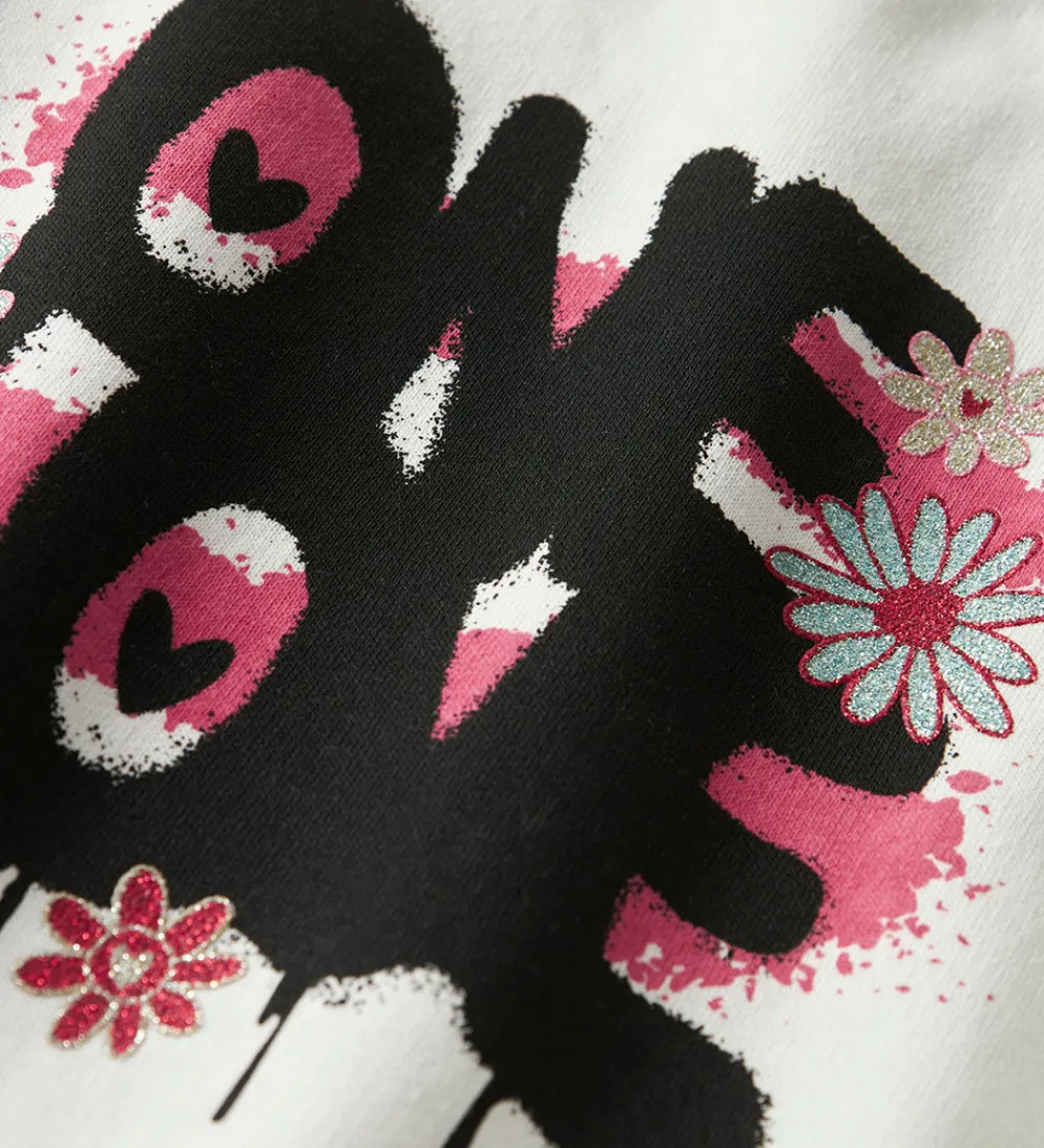 Smart Name It hættetrøje i hvid med et glimmerprint på venstre bryst af en blomst i rød og rosa. På ryggen er der et stort print i sort, pink og blå nuancer med teksten “One Love” og glimmerblomster.