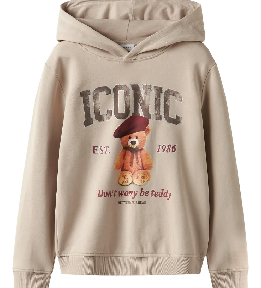 Charmerende Name It hættetrøje i en lysebeige nuance med et sødt print af en bamse på fronten. Bamsen bærer en rød hat, og teksten “ICONIC” er trykt i metalfarver.