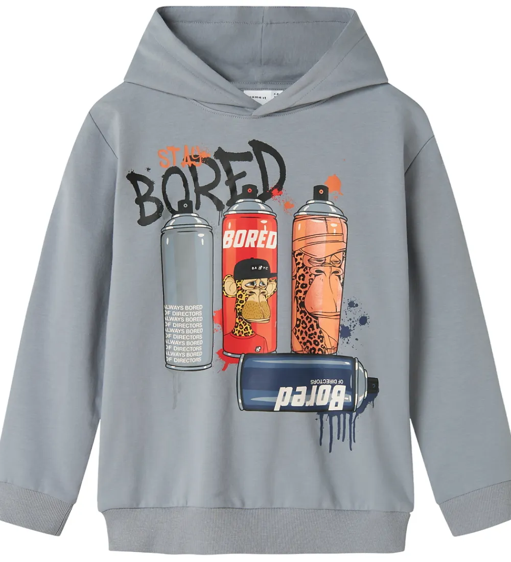 Flot Name It hættetrøje i en grå nuance med et stort print på fronten af farverige spraydåser og teksten “Stay Bored”. På ryggen står teksten “Always Stay Bored” i orange og sort. Hættetræjen har en blød hætte og lange ærmer med ribkanter i ærme- og taljeåbning. Indvendigt er der blødt, børstet bomuld.
