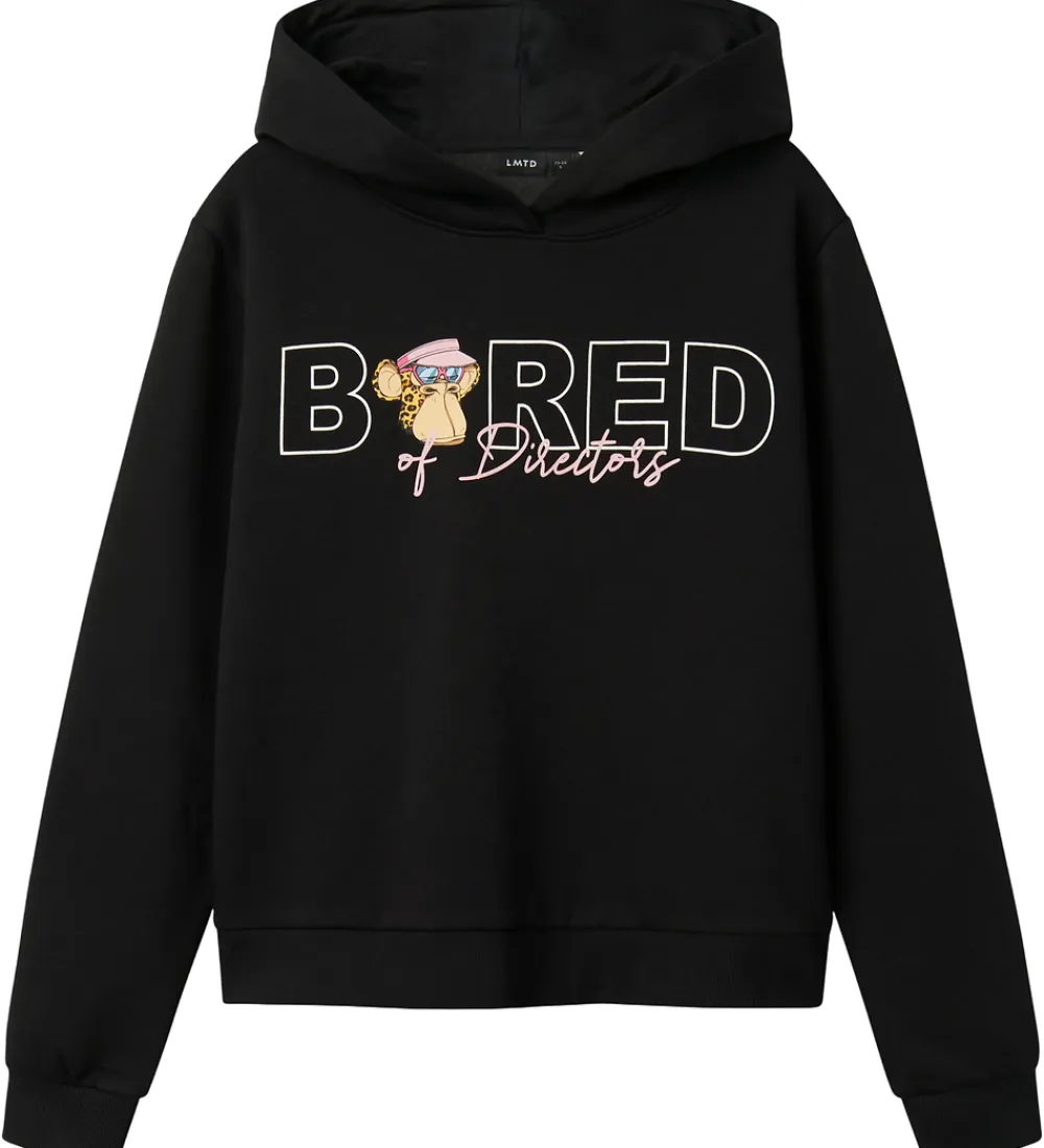Stilfuld LMTD hættetrøje i klassisk sort med teksten “Bored of Directors” på fronten. Motivet inkluderer en farverig illustration, der giver et unikt look, og på ryggen er illustrationen rosa i flere varianter. Hættetrøjen har en rummelig hætte og brede ribkanter ved ærmerne samt i livet, hvilket sikrer en god pasform. Ideel til at tilføre garderoben et moderne præg.
