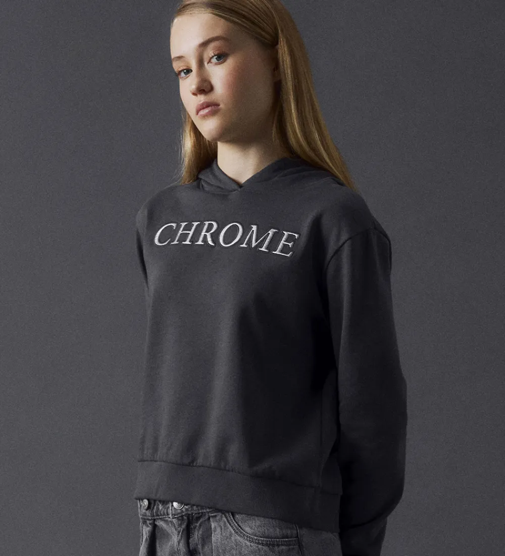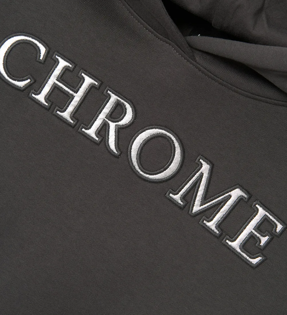 Flot LMTD hættetrøje i en stilren, mørkegrå nuance med teksten “CHROME” broderet på fronten. LMTD hættetrøjen har lange ærmer og en klassisk hætte. Ribkanter ved håndleddene og forneden sikrer en god pasform.