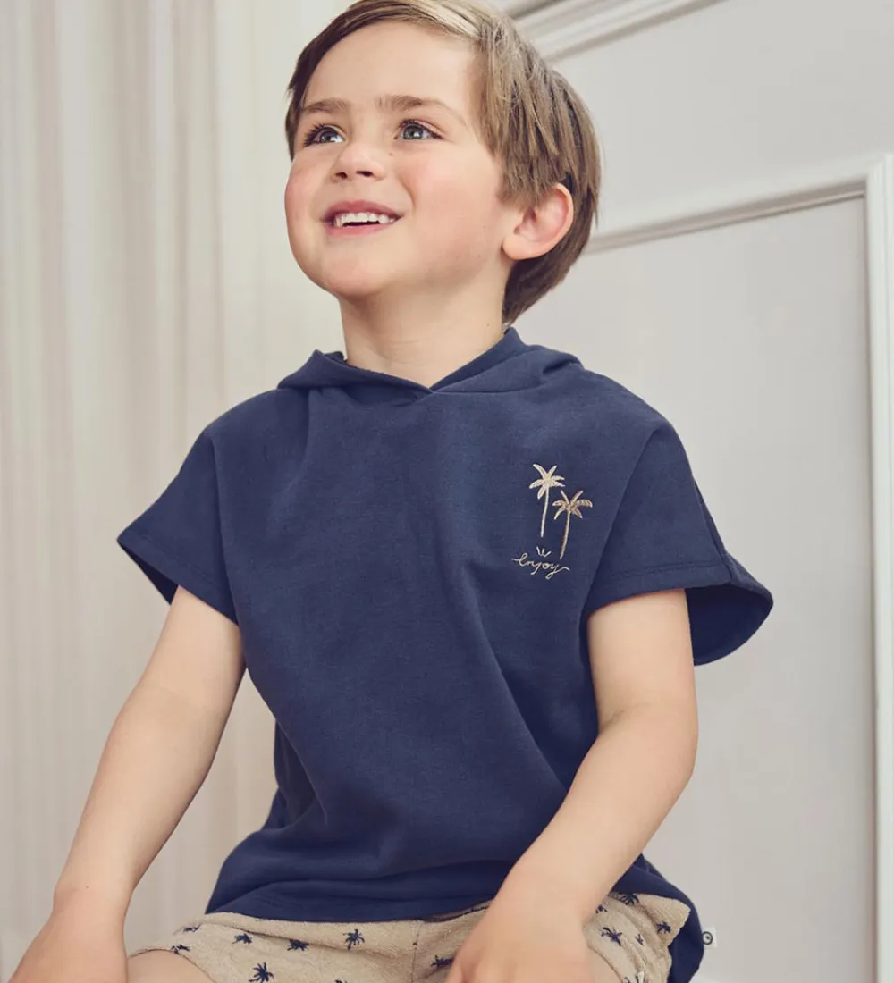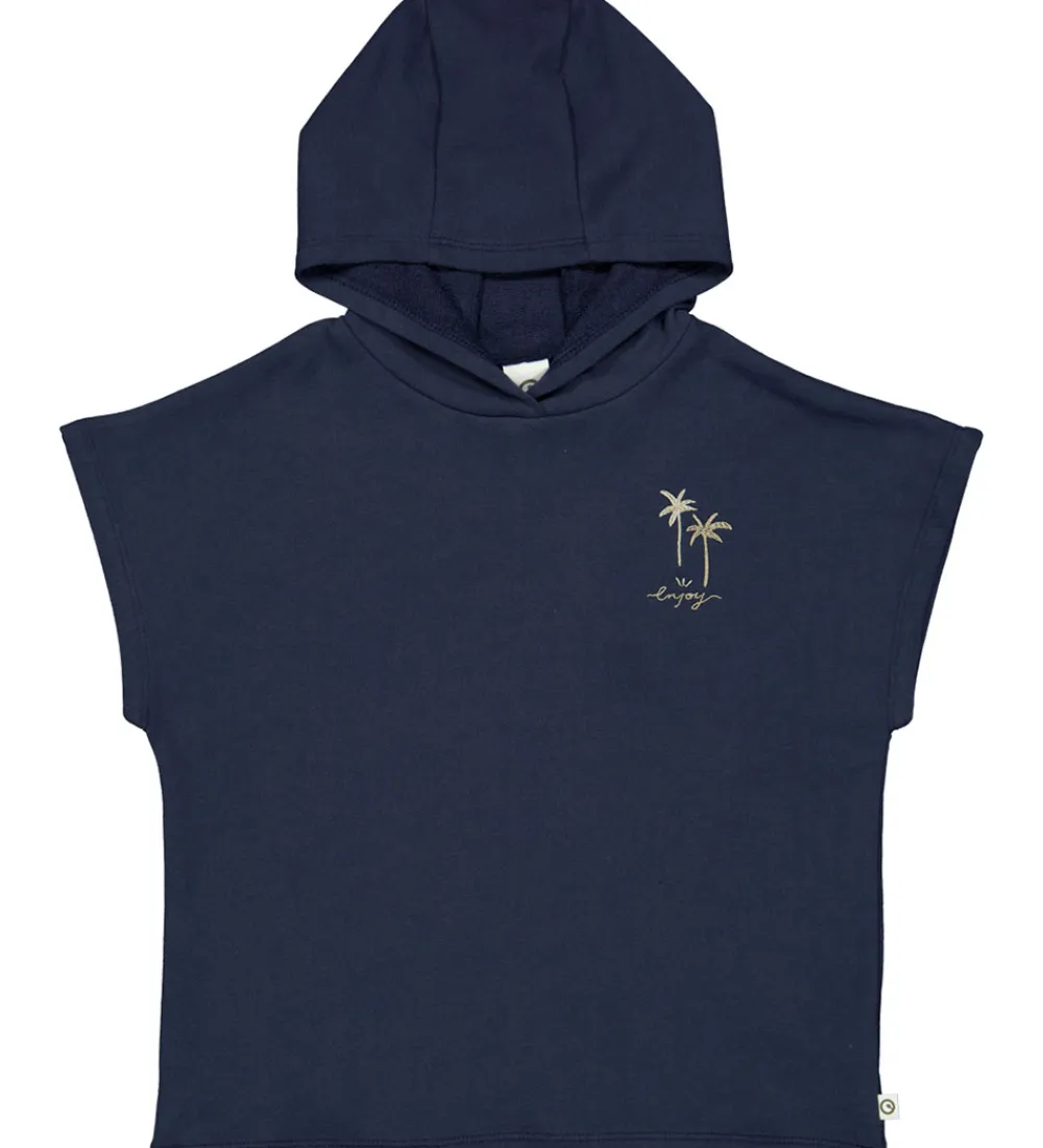 Smart Müsli hættetrøje i navyblå med broderede palmer og teksten “Enjoy” i beige. Hættetrøjen har en fastsyet blød hætte og er uden ærmer, så den er perfekt som et lag udenover en t-shirt eller bluse.