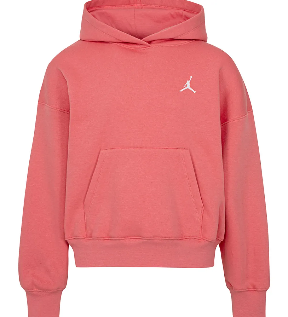 Lækker Jordan hættetrøje i en pink nuance med et hvidt broderet logo på venstre bryst. Denne hættetrøje har en praktisk kængurulomme og en behagelig hætte, perfekt til både afslapning og leg. På indersiden er der blødt, børstet bomuld.