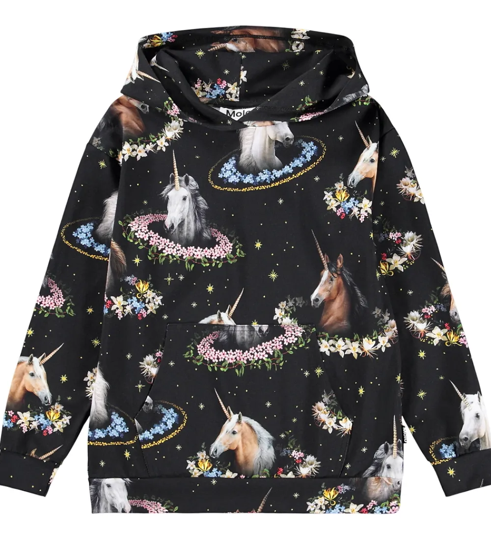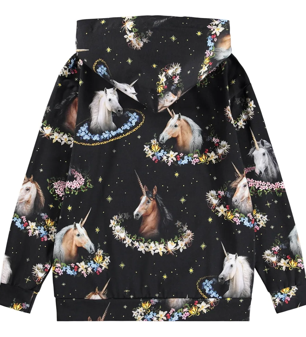 Charmerende Molo hættetrøje med et eventyrligt print af enhjørninger omringet af blomsterkranse på en sort baggrund. Hættetrøjen har en praktisk kængurulomme foran og er i en glat og let bomuldskvalitet.