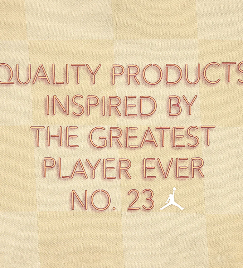 Smart Jordan hættetrøje i lys beige med et diskret ternet mønster, og fortil er der trykt et stort, hvidt logo samt tallet “23” i neonorange med røde kanter, og på ryggen er der et stort tekstprint i neonorange med røde detaljer.