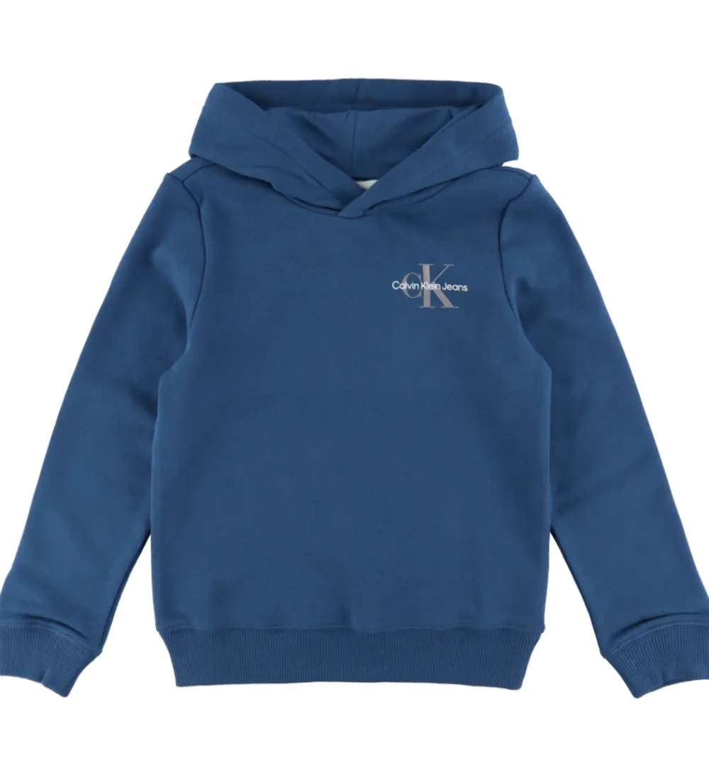 Stilfuld Calvin Klein hættetrøje i en støvet mørkeblå. Hættetrøjen har et flot Calvin Klein Jeans logoprint placeret på venstre brystet i grå og hvid.