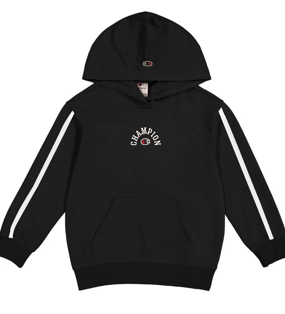Stilren Champion hættetrøje i sort med et stort logoprint broderet på fronten. Hættetrøjen har smarte kontraststriber på ærmerne i hvid og en praktisk kængurulomme. Hættetrøjen har en klassisk pasform og er ideel til hverdagens aktiviteter.