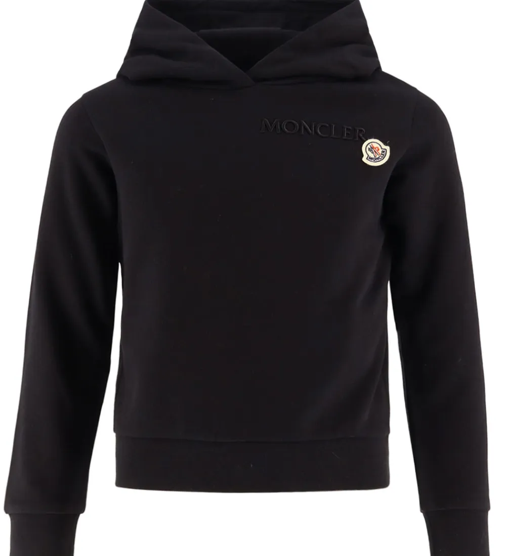 Elegant Moncler hættetrøje i klassisk sort med et diskret logo broderet på brystet. Moncler hættetrøjen har en praktisk hætte og lange ærmer. Designet er stilrent og uden mønster, mens den har ribkanter ved håndled og talje, hvilket giver en god pasform. Hættetrøjen har blødt, børstet bomuld på indersiden.