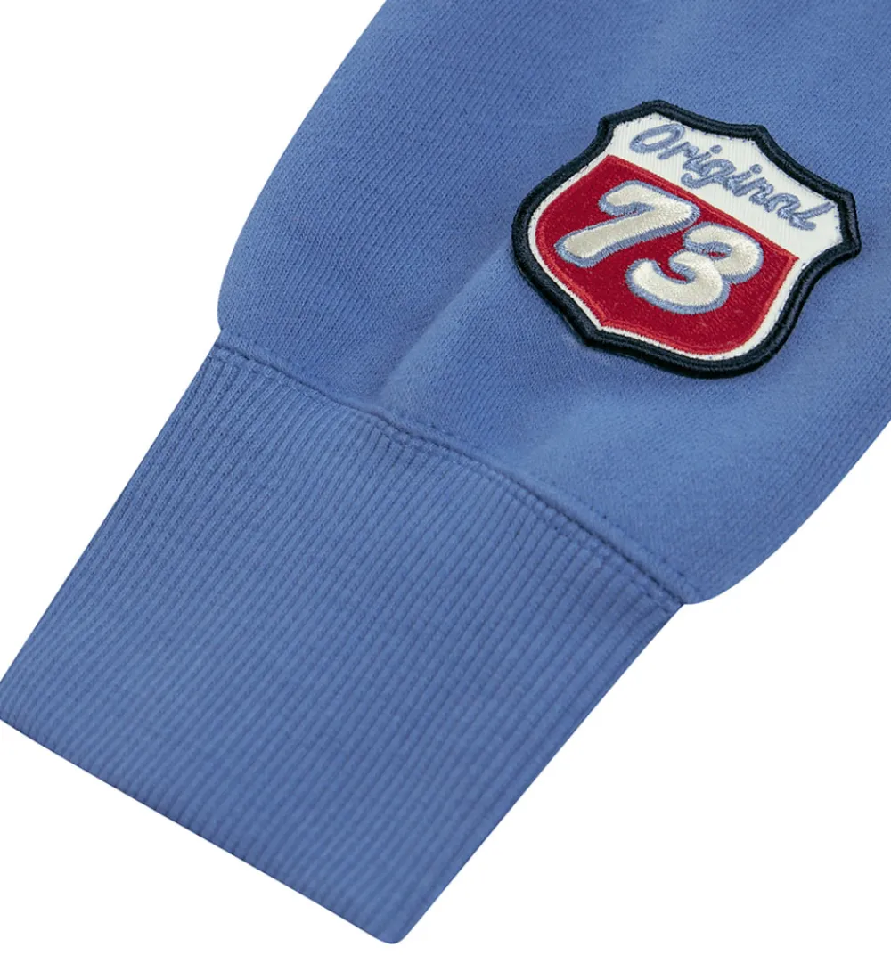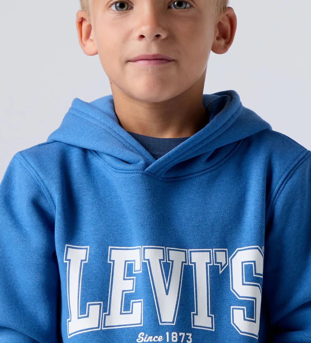 Elegant Levis hættetrøje i en fin, blå farve med et klassisk, hvidt logoprint på fronten. Hættetrøjen har en praktisk kængurulomme på maven. Levis hættetrøje er designet med ribkanter ved håndleddene og i bunden, hvilket sikrer en god pasform.