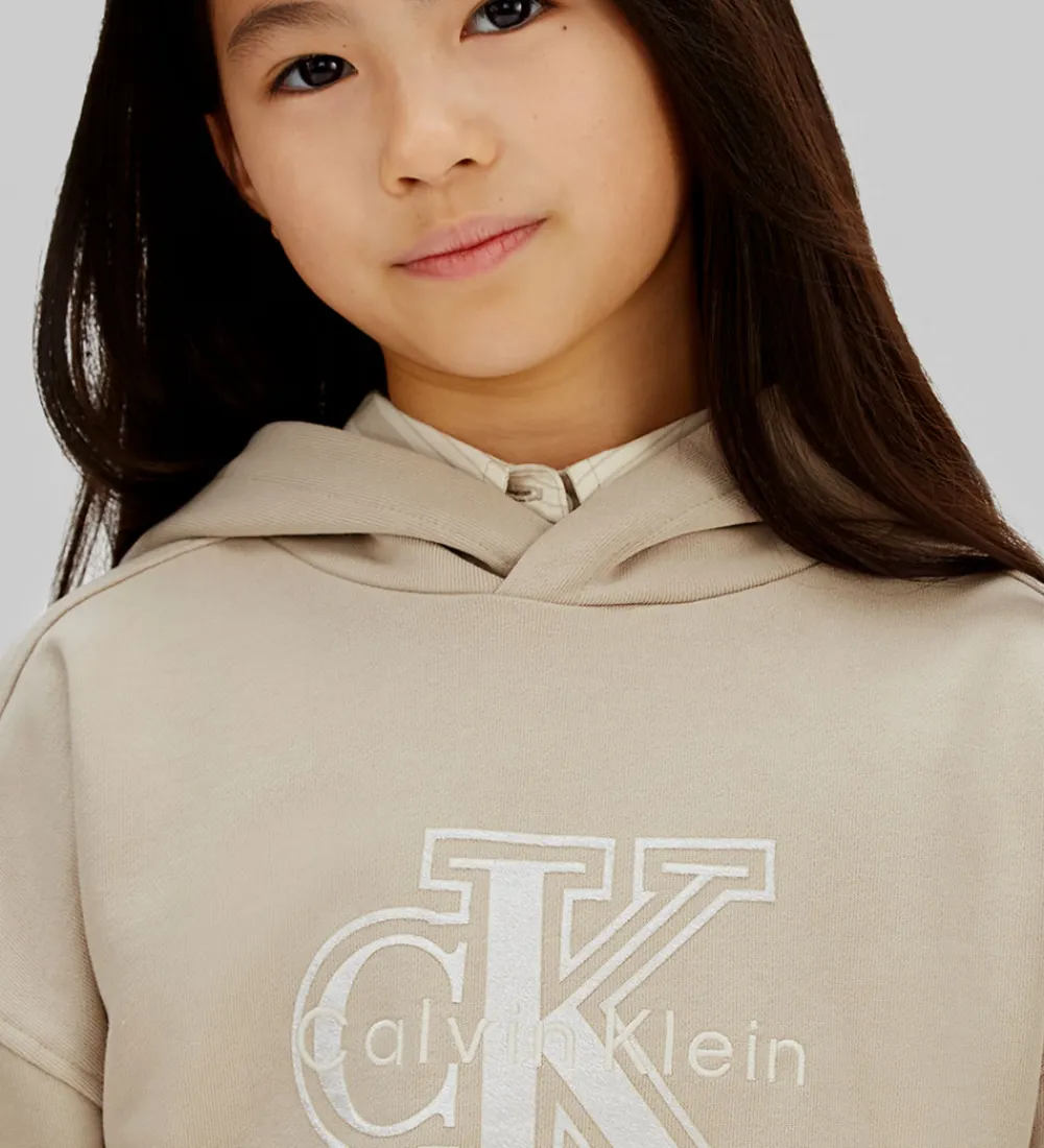 Elegant Calvin Klein hættetrøje i en stilren beige nuance, dekoreret med det ikoniske Calvin Klein logo i velour på fronten. Hættetrøjen har en praktisk hætte og er designet med ribkanter ved håndleddene og i livet, der giver en flot pasform.