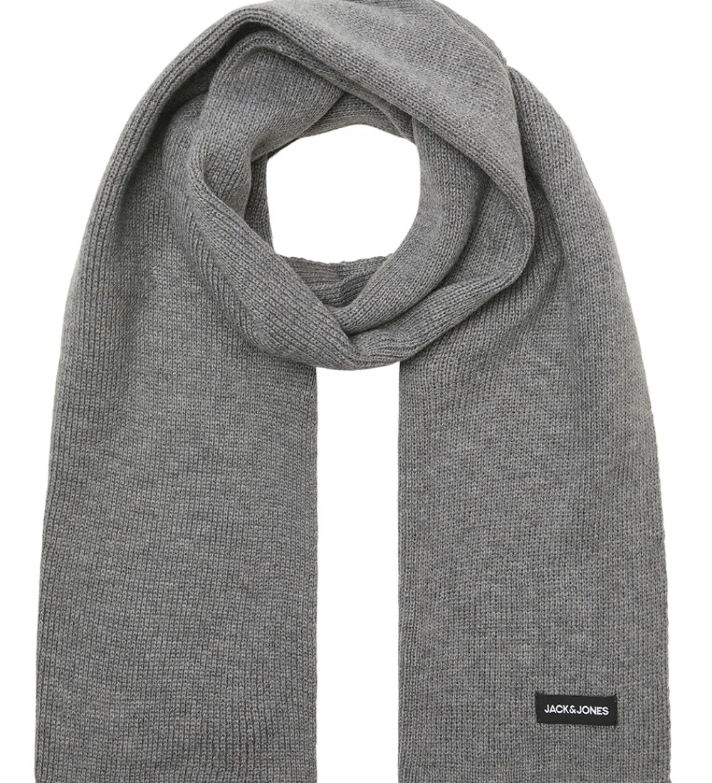 Dejligt Jack & Jones halstørklæde i gråmeleret strik og en lille logopatch.
