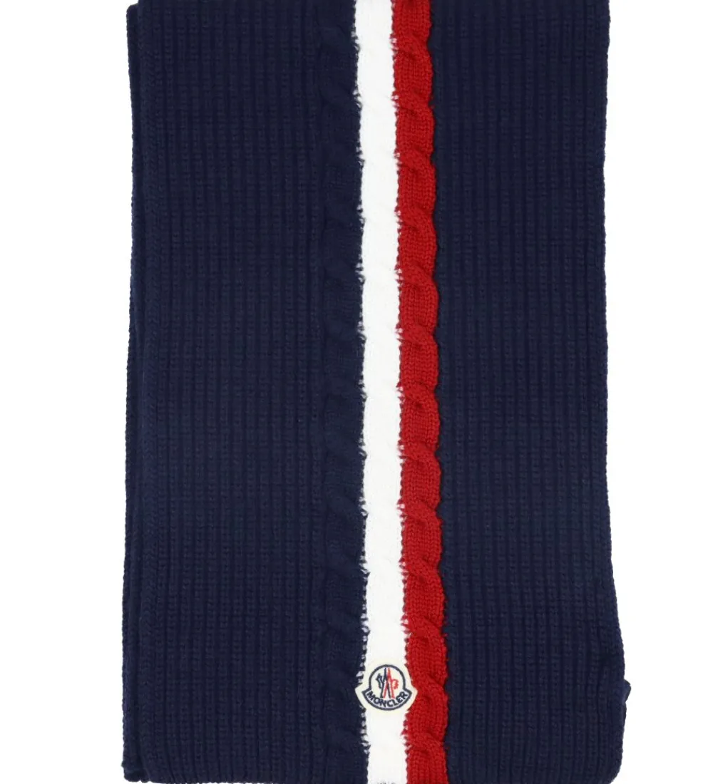 Lækkert Moncler halstørklæde i navy, og ned gnnem midten er der en smal stribe i rød og hvid.