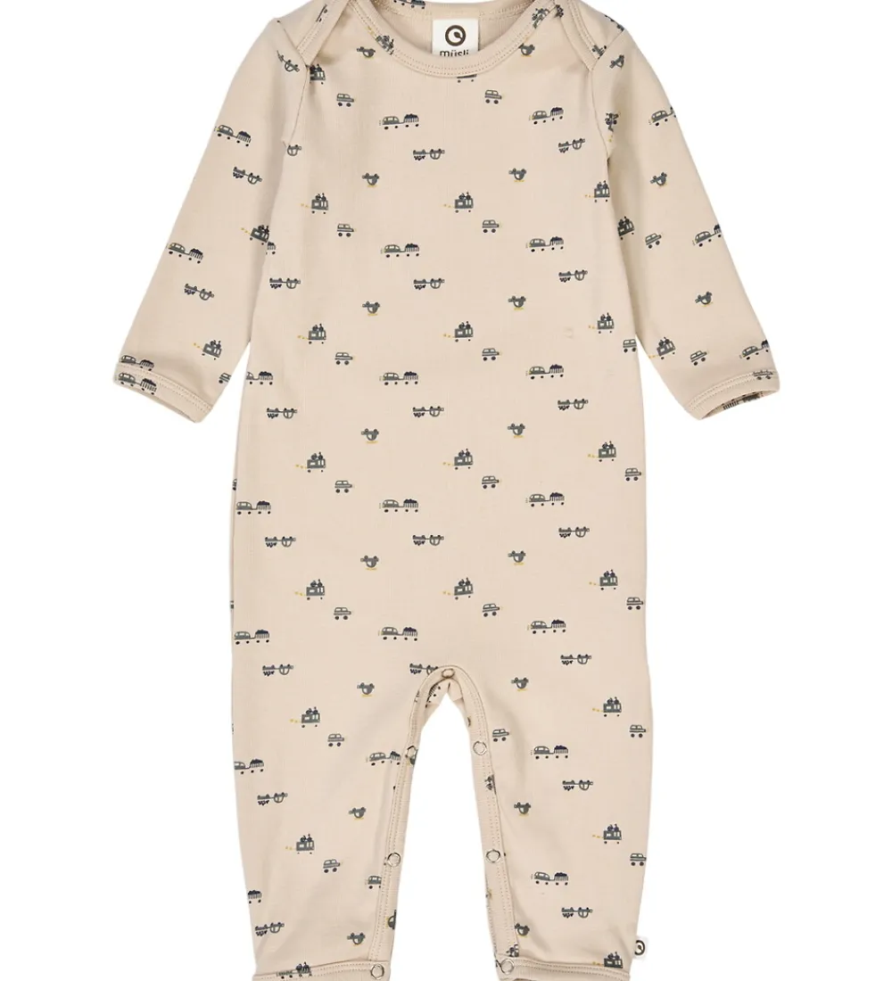 Elegant Müsli heldragt i en dæmpet beige farve med et diskret print af små biler og med en fin ribstruktur.