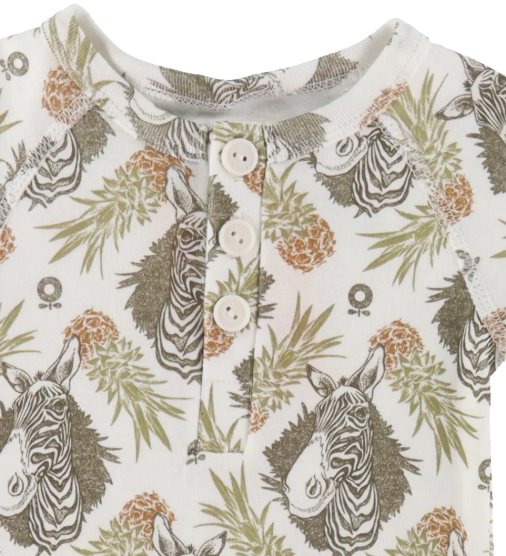 Skøn Katvig heldragt i hvid med et tropisk alloverprint af zebra og ananas i grønne og brune nuancer.