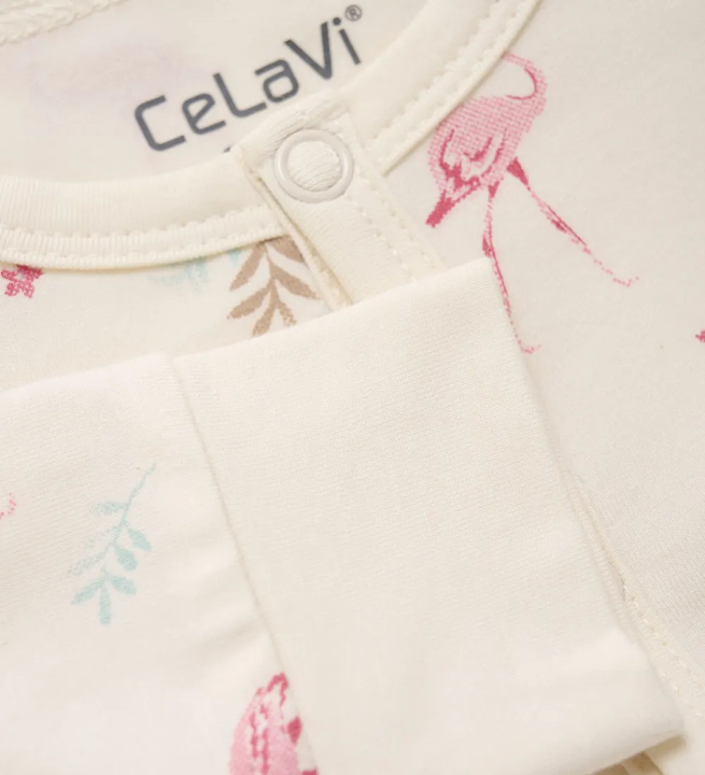 Skøn CeLaVi heldragt i cremehvid med et alloverprint af søde flamingoer og palmeblade i rosa, brune og grønne nuancer.