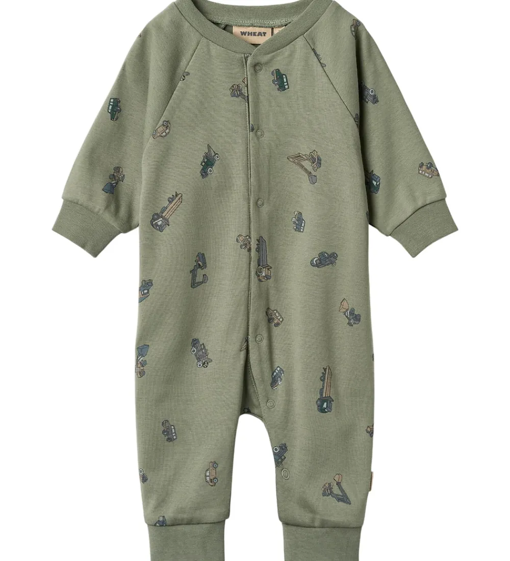 Skøn Wheat heldragt i en afdæmpet grøn farve med små motiver af forskellige køretøjer.