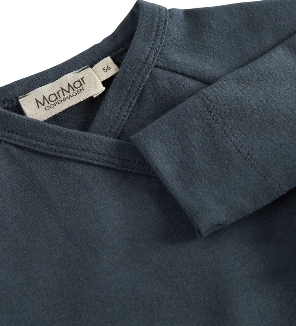 Heldragten fra MarMar har lange ærmer og ben med faste fødder, og den lukkes med trykknapper langs siden. En praktisk bindedetalje ved siden giver et ekstra touch til designet.