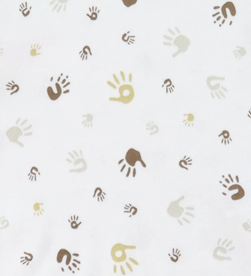 Praktisk Joha heldragt i off white med alloverprint af søde håndaftryk i brune og beige farver.