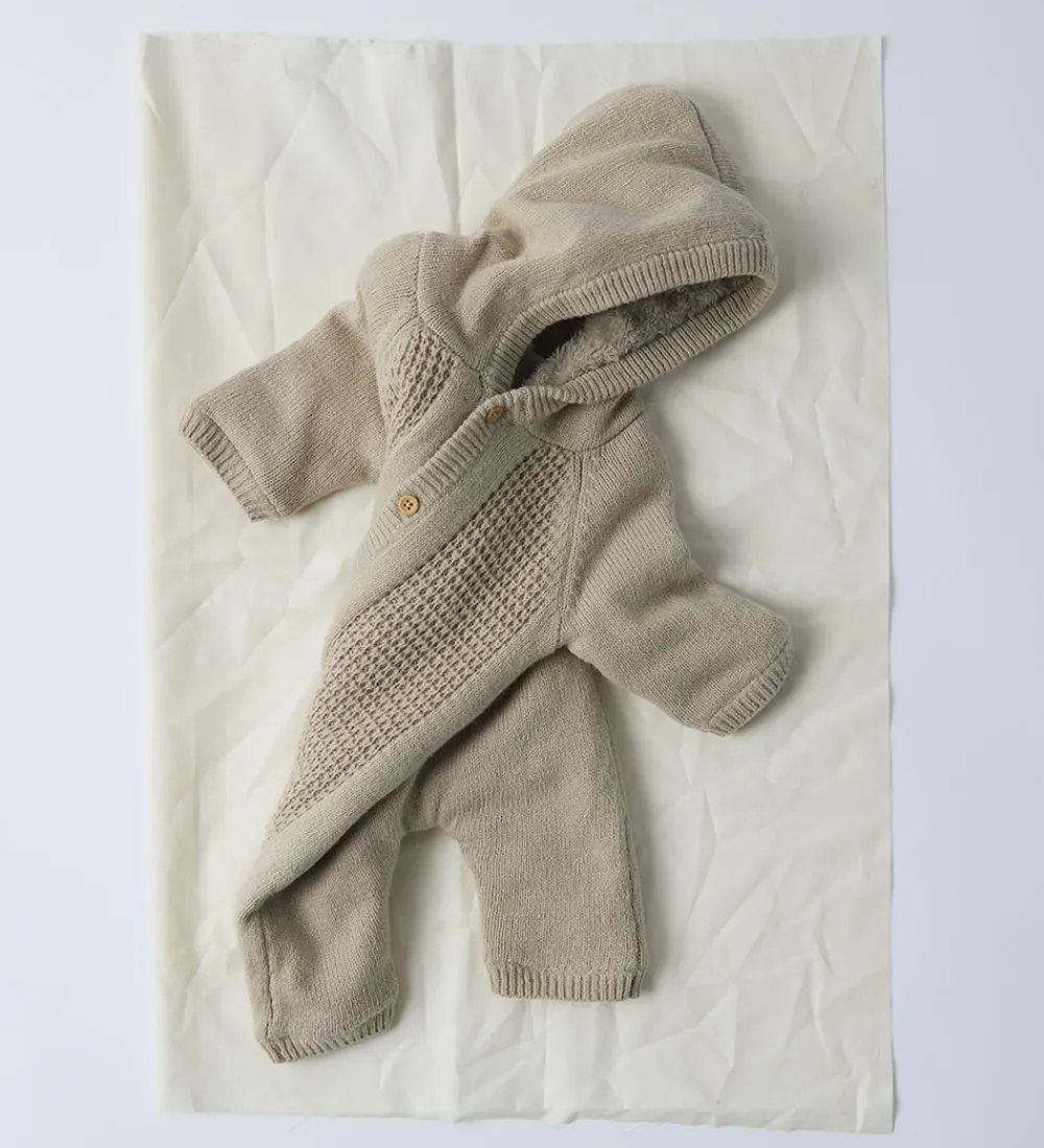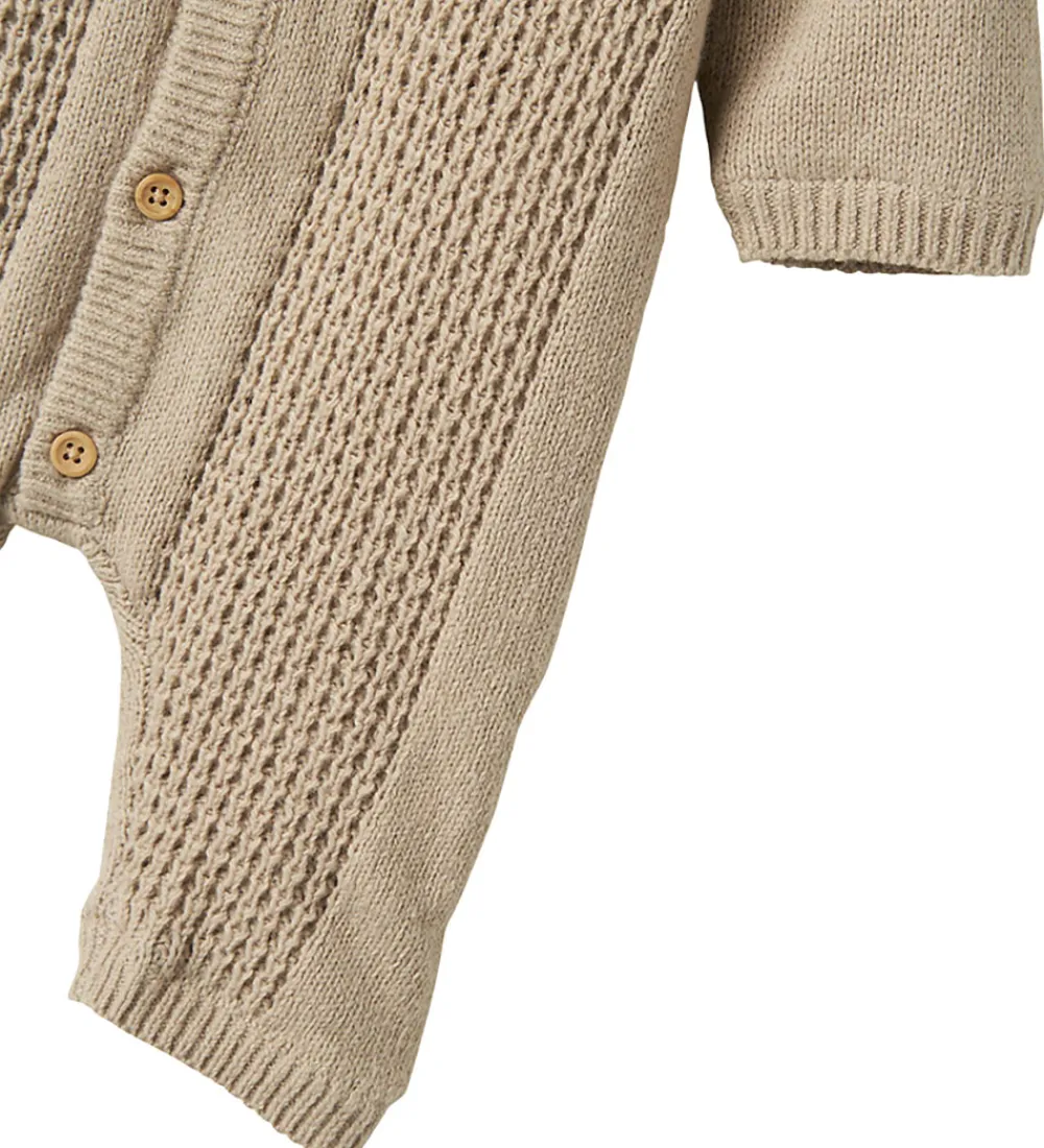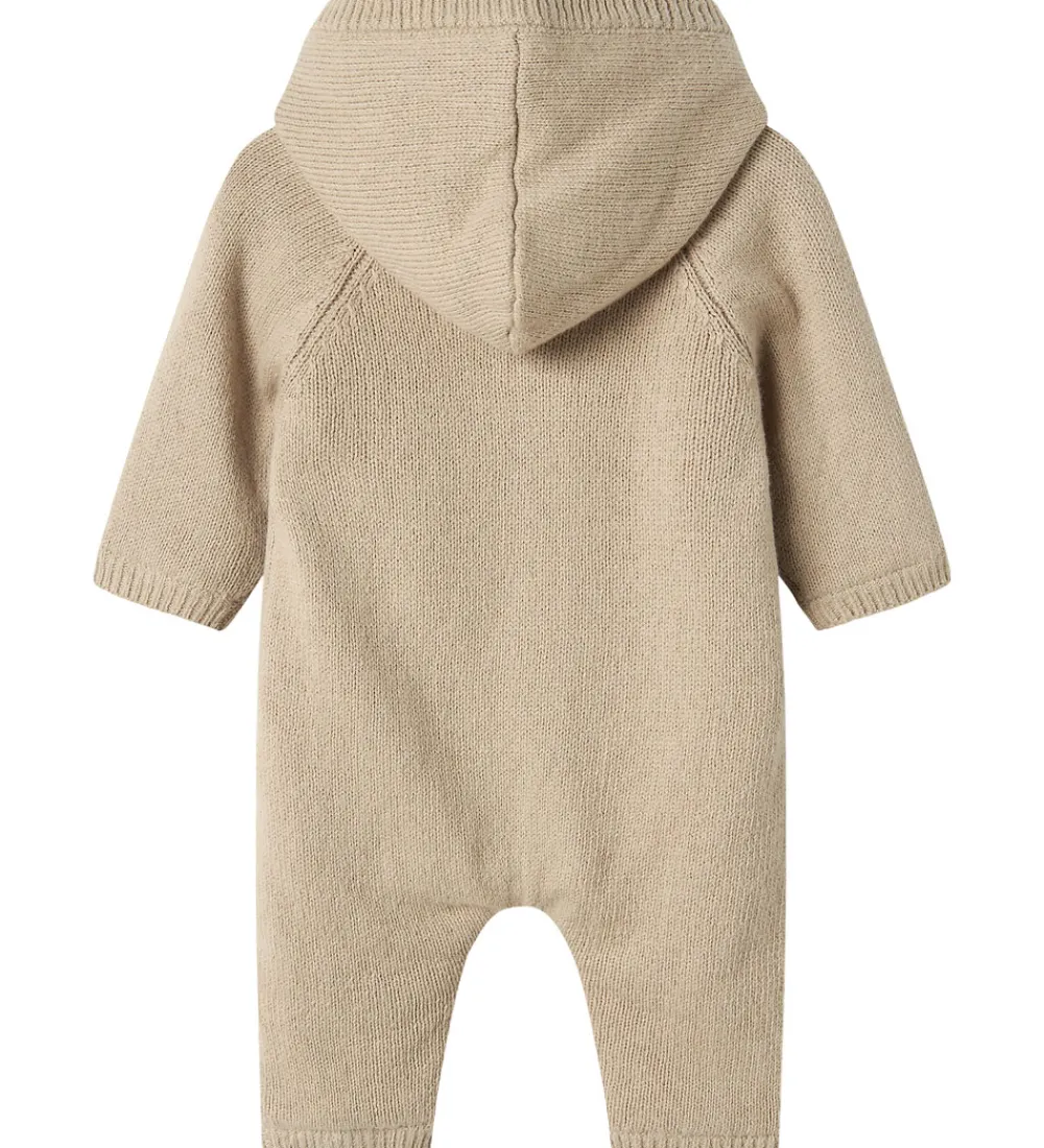 Behagelig Name It heldragt i beige strik med strukturstrik fortil. Heldragten er designet med lange ærmer og ben samt en praktisk hætte. Name It heldragten er udstyret med knapper langs fronten, der gør det nemt at åbne og lukke. Indvendigt er der blødt plysfor, som gør den ideel til kolde dage.