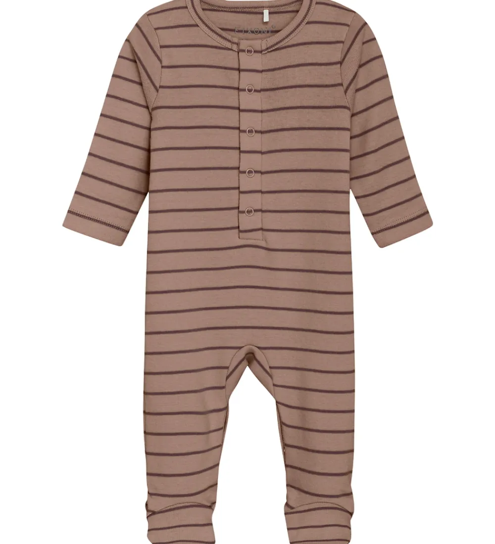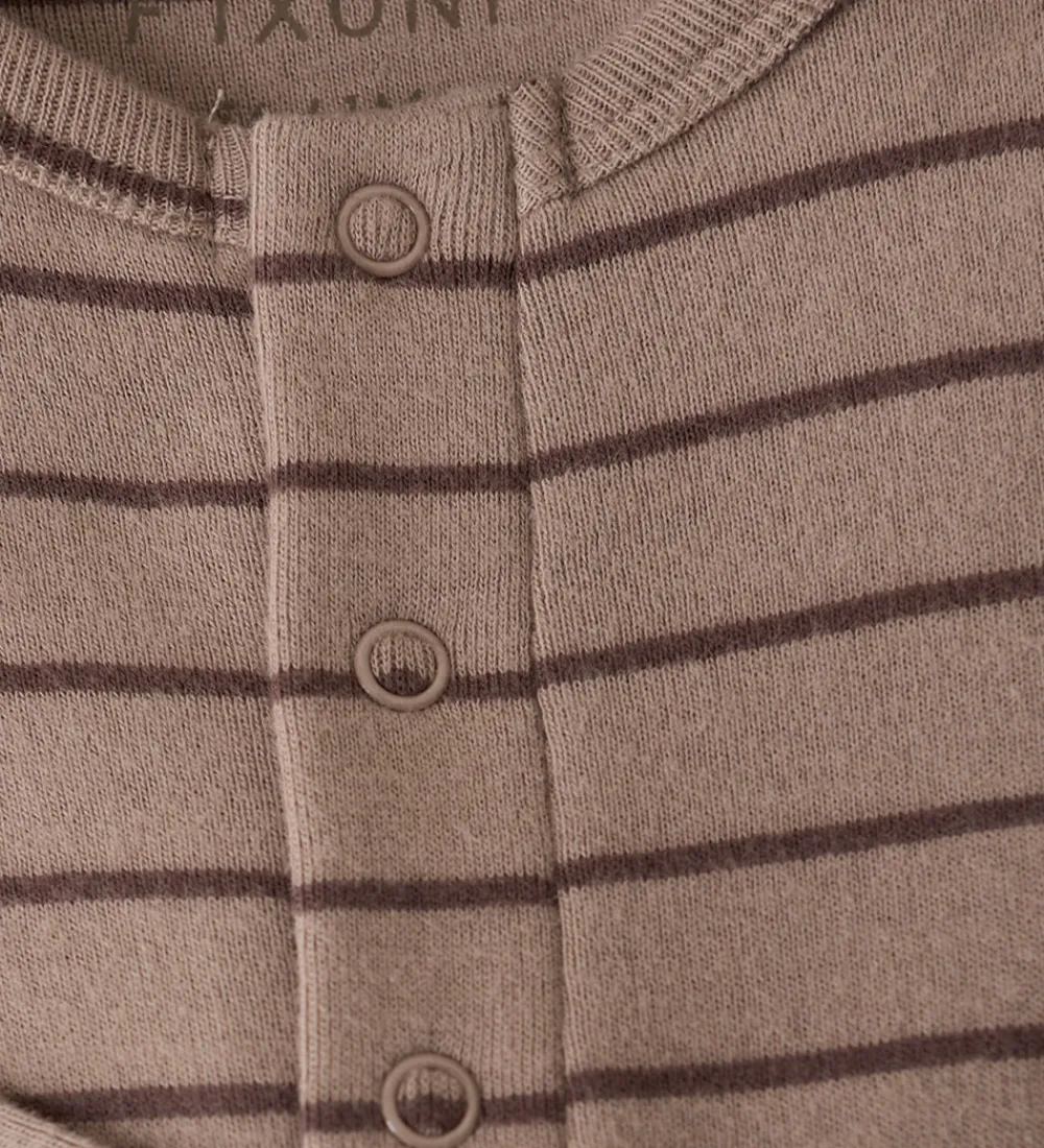 Elegant Fixoni heldragt i en varm, brun nuance med et vandret, stribet mønster. Fixoni heldragten har lange ærmer og ben med fødder. Der er praktiske trykknapper på fronten og mellem benene for nem påklædning og afklædning.