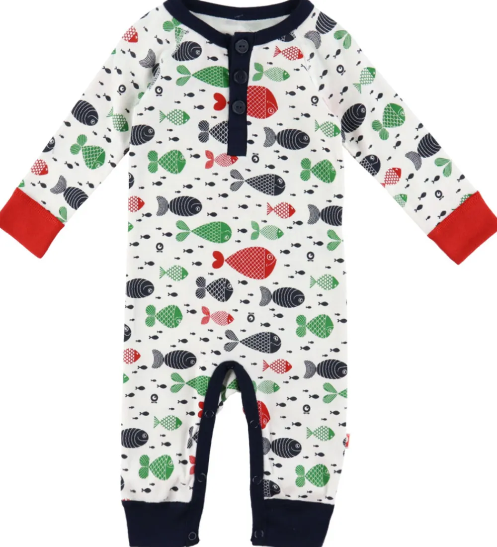 Skøn Katvig heldragt i hvid med et farverigt fiskeprint. Den har en rund halsudskæring med knaplukning fortil og lange ærmer. Heldragten lukkes med praktiske trykknapper mellem benene. Den har brede ribkanter i rød og navyblå.
