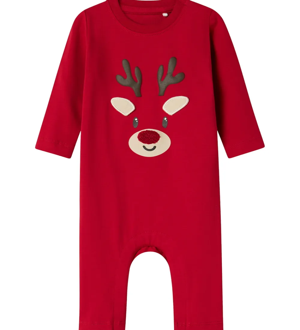 Charmerende Name It heldragt i en klar rød farve med en sød applikation af et rensdyrhoved på fronten. Heldragten har en rund halsudskæring med trykknapper ved venstre skulder og lange ærmer. Den lukkes mellem benene med trykknapper.