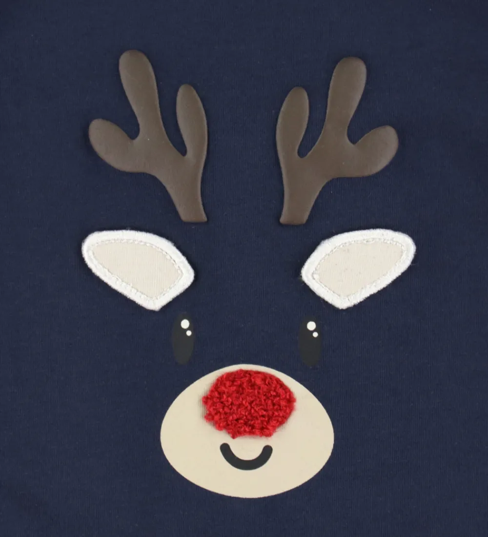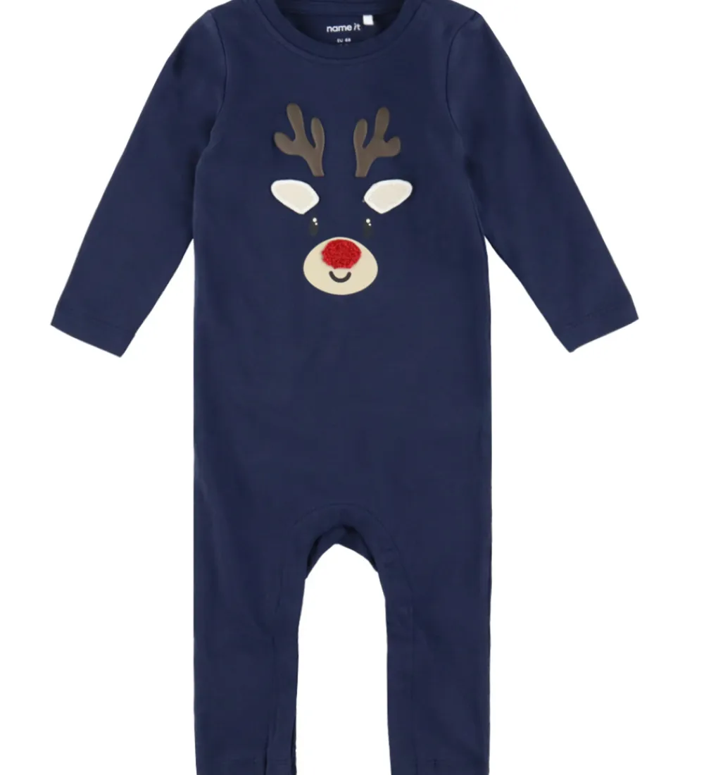 Sød Name It heldragt i navyblå med en sød applikation af et rensdyrhoved på fronten. Heldragten har en rund halsudskæring med trykknapper ved venstre skulder og lange ærmer. Den lukkes mellem benene med trykknapper.