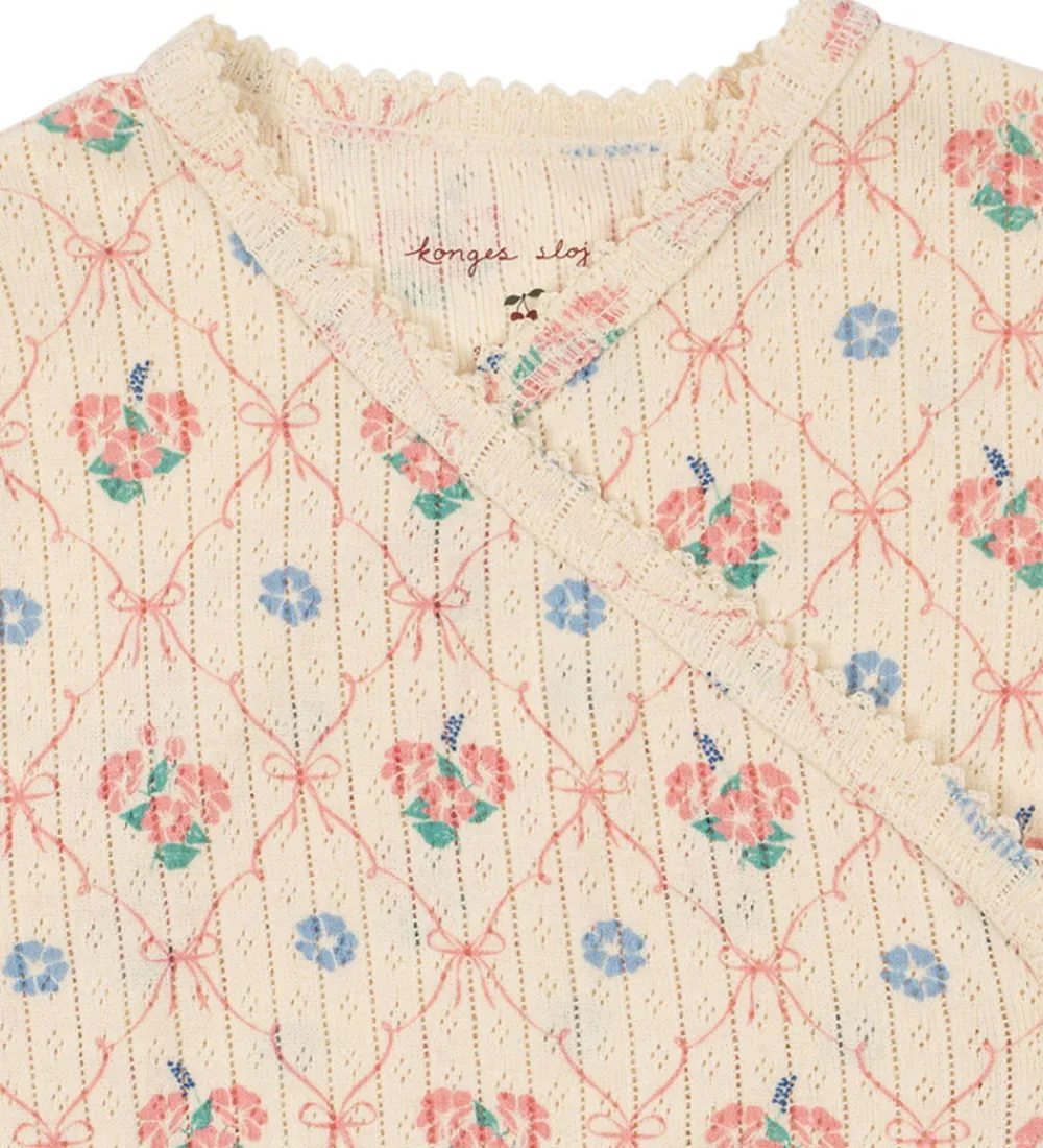 Charmerende Konges Sløjd heldragt i en lysebeige dekoreret med et blomstermønster i blide nuancer af grøn, rød og blå.
