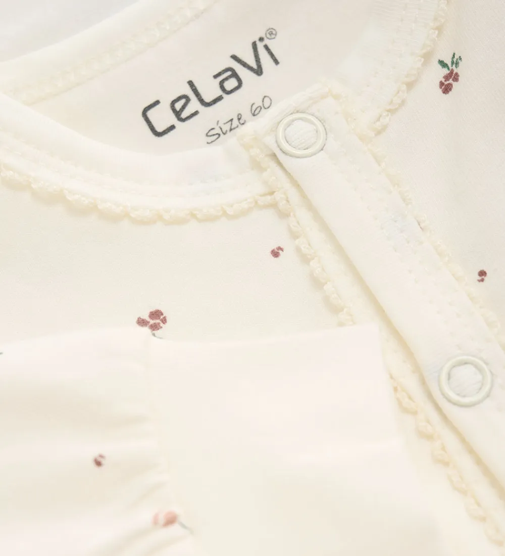 CeLaVi heldragten har lange ærmer og lange ben med brede ribkanter. Heldragten åbnes med gennemgående trykknapper fra halsen til venstre fod, og den har smalle ribkanter med smalle blonder i hals- og kropsåbningen.