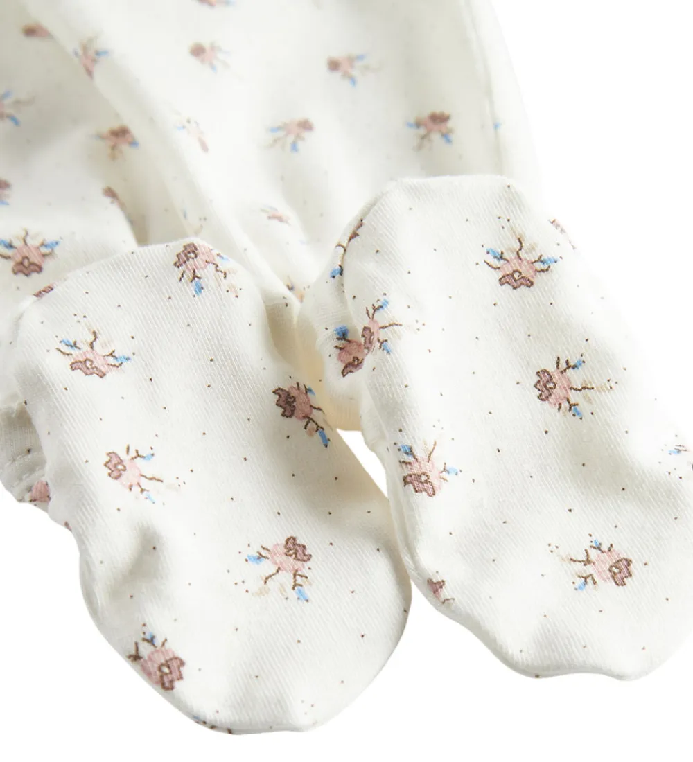 Charmerende MarMar heldragt i hvid med et delikat blomsterprint og små prikker. Denne heldragt har lange ærmer og ben, som giver et stilrent udtryk. MarMar designet er udstyret med en praktisk slå-om lukning med bindebånd og trykknapper.
