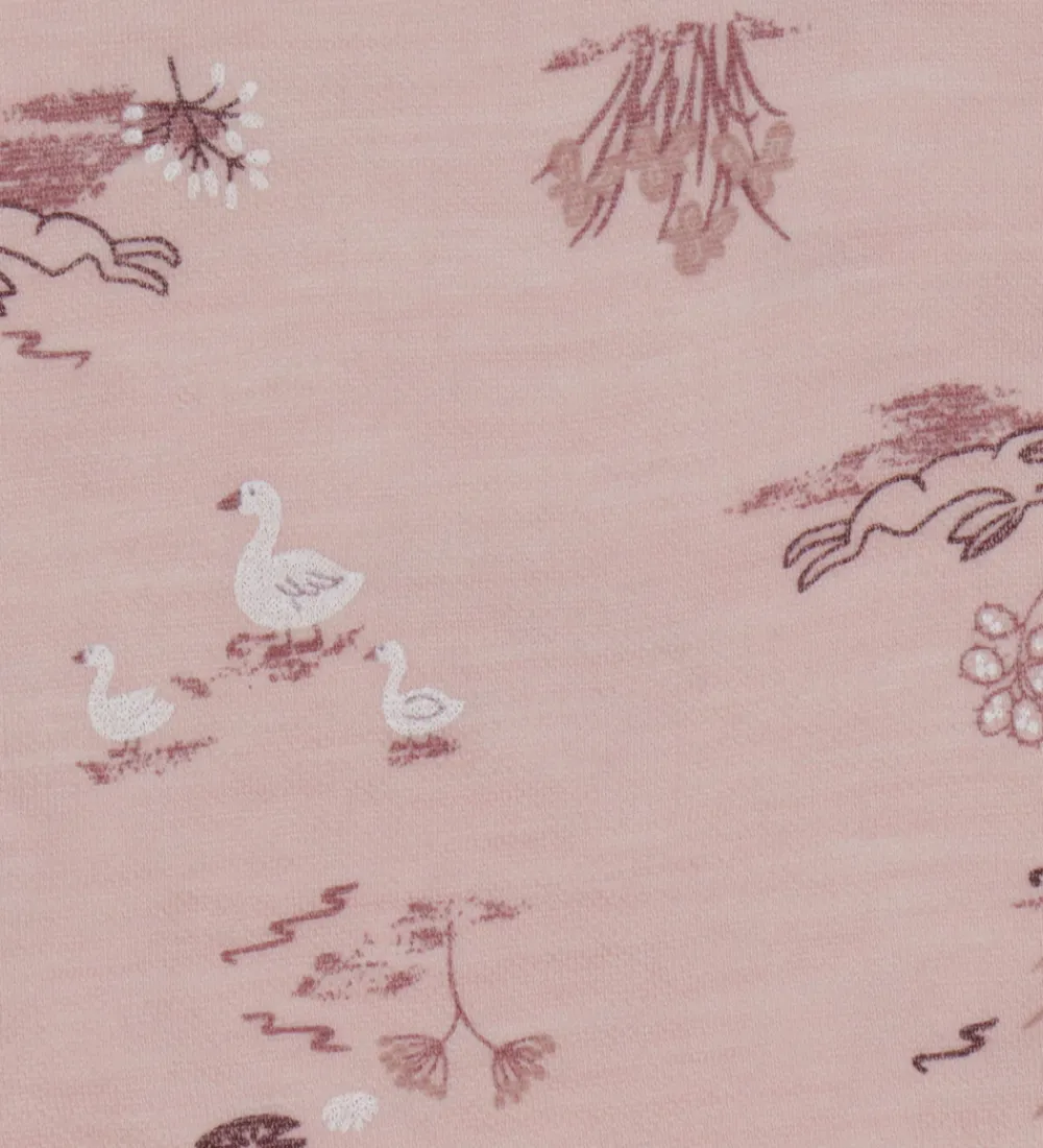 Charmerende Joha heldragt i en støvet rosa farve med et naturinspireret print af blomster og fugle. Det subtile mønster gør heldragten både sød og enkel.