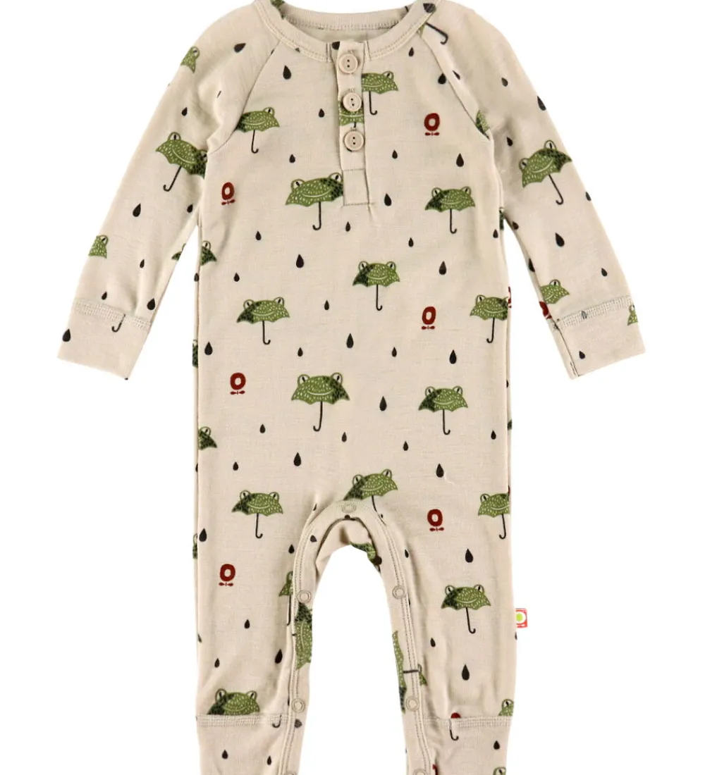 Charmerende Katvig heldragt i en lys beige nuance med et sødt, grønt print af frø-paraplyer og sorte dråber. Heldragten har en rund halsudsklæring og tre knapper foran. Den har lange lærmer og lange ben med brede kanter. Den lukkes mellem benene med trykknapper. Heldragten er fremstillet af økologisk merinould.