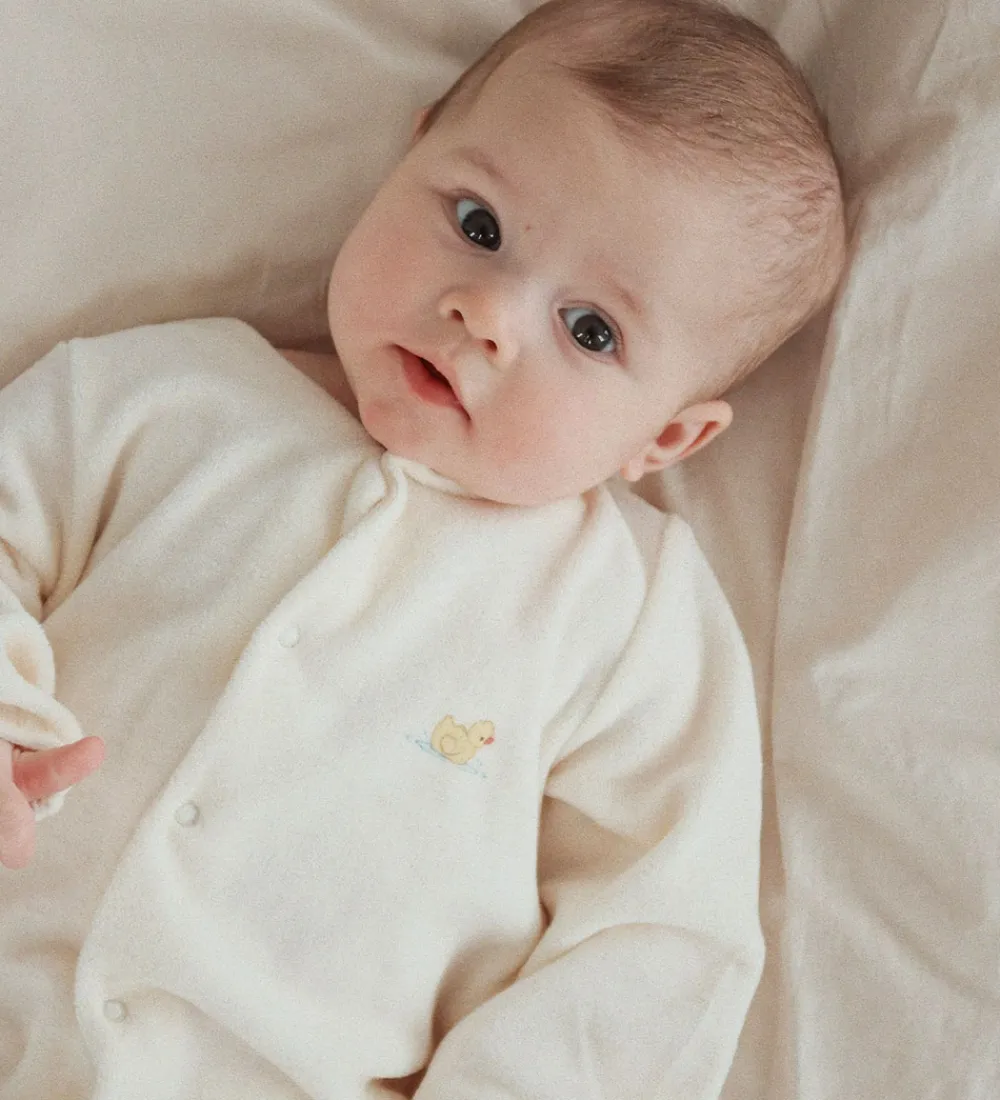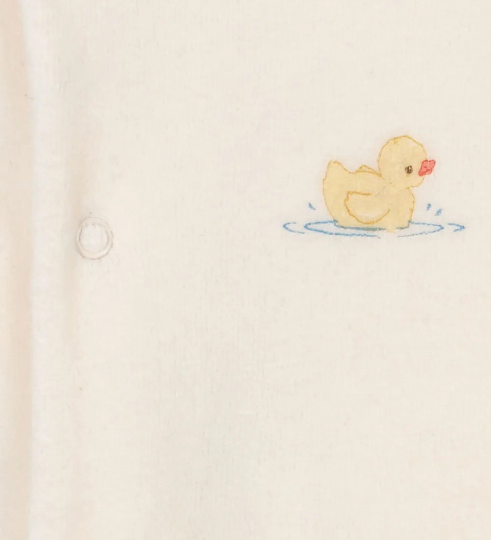 Praktisk Fanga Fontana heldragt i en blød, cremefarvet nuance med velourstruktur og med et lille andeprint på brystet.