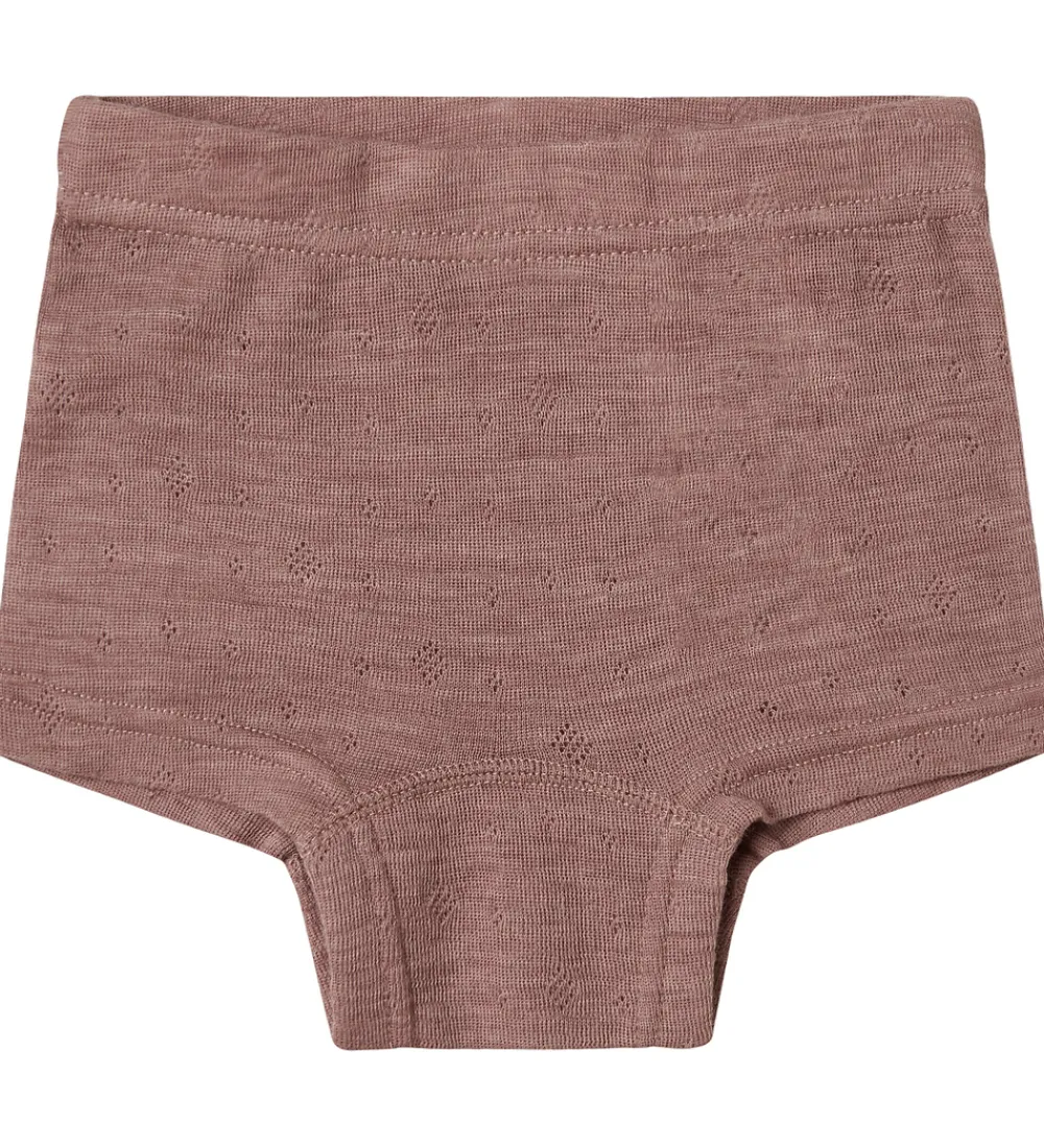 Smarte Name It hipsters i støvet lilla med fint hulmønster. Hipstersene har en god elastik i taljen, som sikrer en behagelig pasform. De er fremstillet i blødt og åndbart merinould.