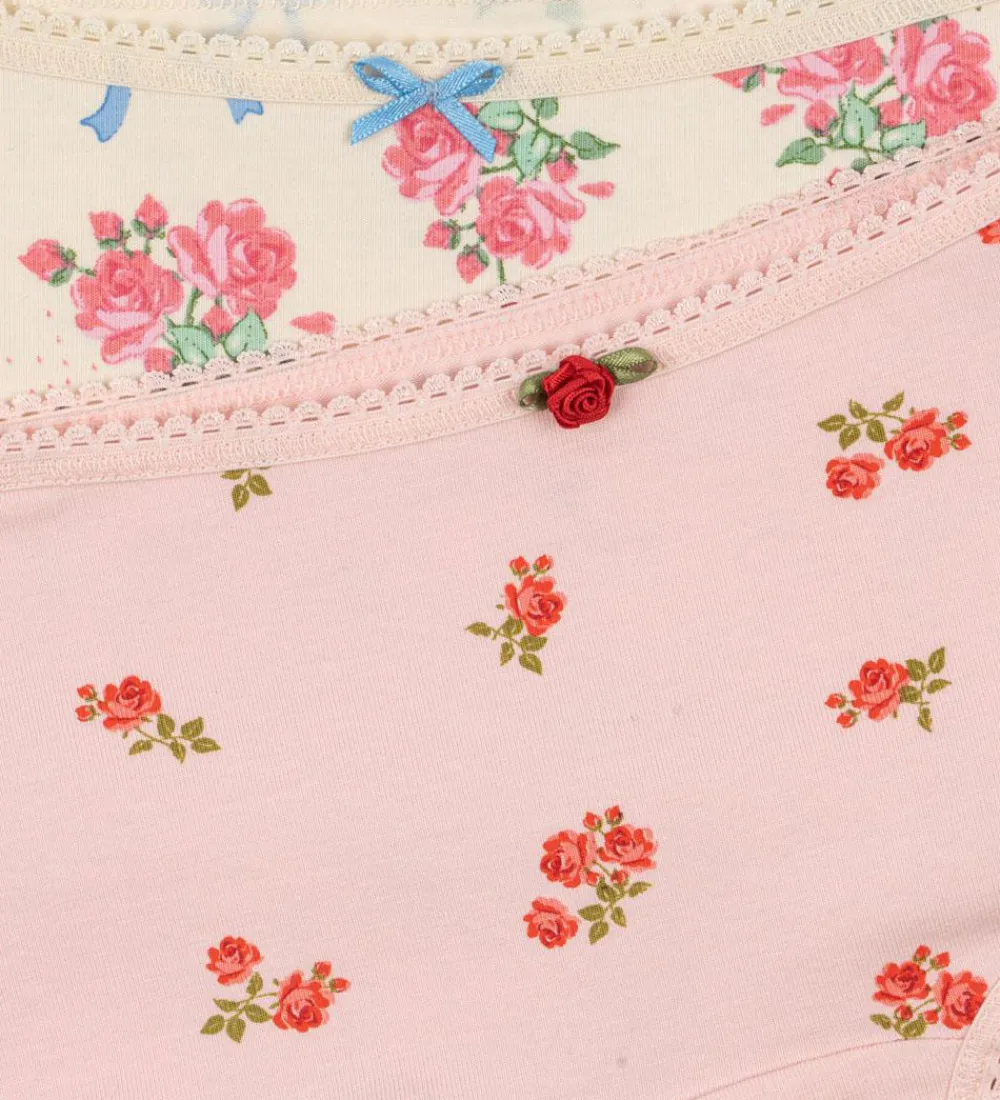 Et par er lyserødt med små, røde blomster og en dekorativ rød rose foran. Det andet par har en cremefarvet base med store, lyserøde blomster og blå sløjfer. Begge par har elastik i livet, som sikrer en god pasform.