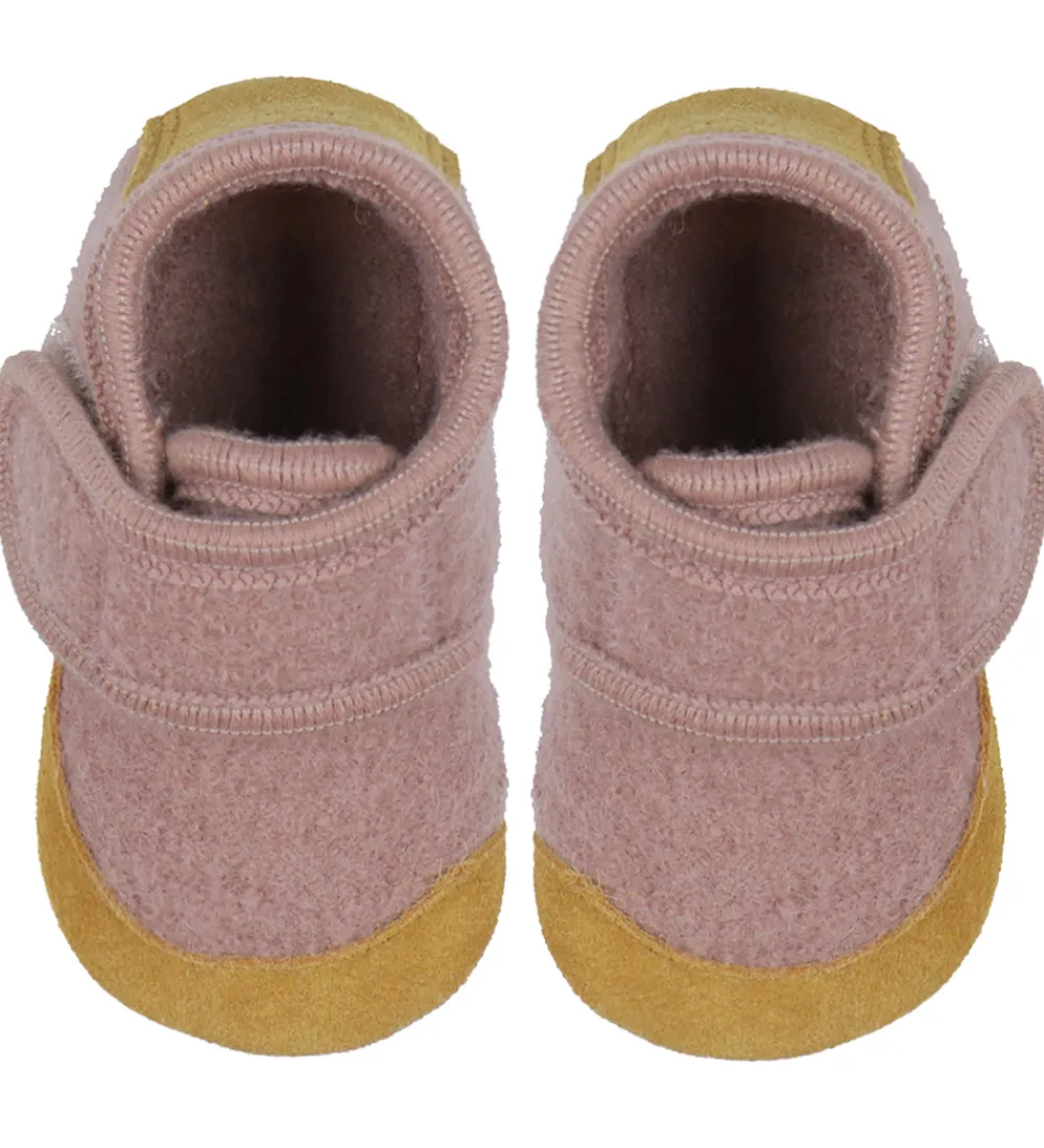 Søde En Fant hjemmesko i rosa uld med lysebrunt ruskind på snuden og hælen.