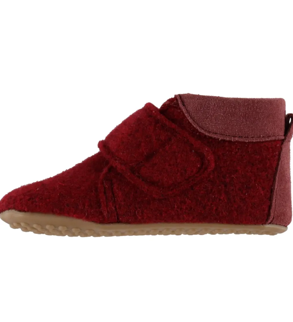 Fine Pom Pom hjemmesko i bordeauxrødt uld, med en fin detalje af rødt ruskind på hælen.