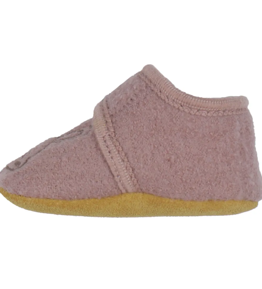 Søde En Fant hjemmesko i rosa uld med en broderet kanin på foden.