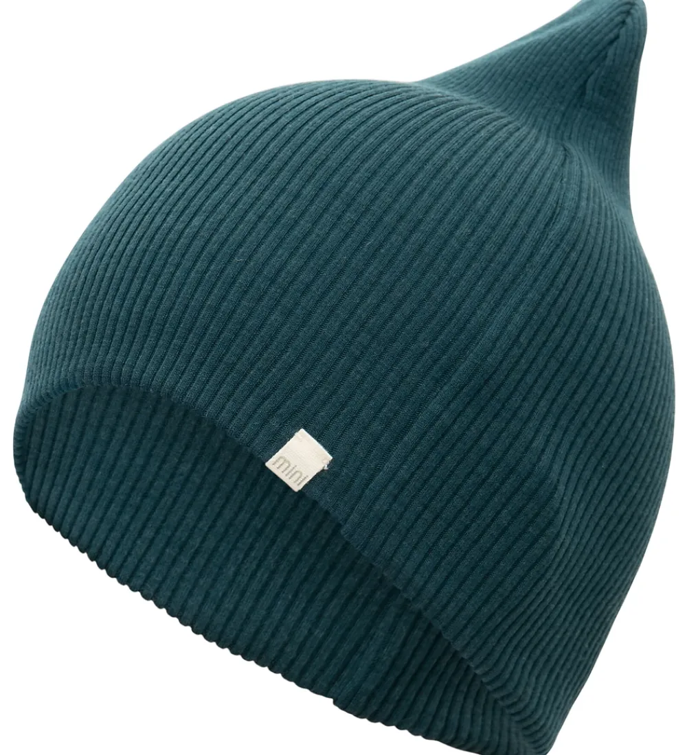 Elegant Minimalisma hue i en dyb petroleumsfarve med ribstruktur, og den er lavet af blødt merinould.. Minimalisma huen har en rund hovedform, og den består af to lag.