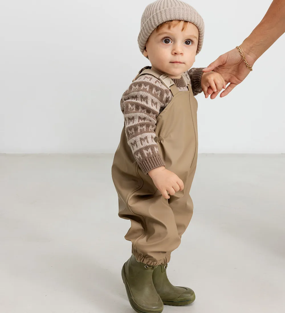 Skøn MarMar babyhue i ensfarvet beige i en strikket kvalitet med ribstruktur. Huen har en rund hovedform, og den har en bred kant med ombuk.