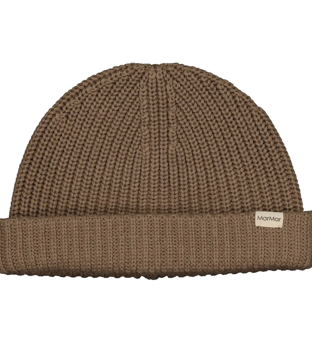 Lækker MarMar babyhue i ensfarvet brun i en strikket kvalitet med ribstruktur. Huen har en rund hovedform, og den har en bred kant med ombuk.