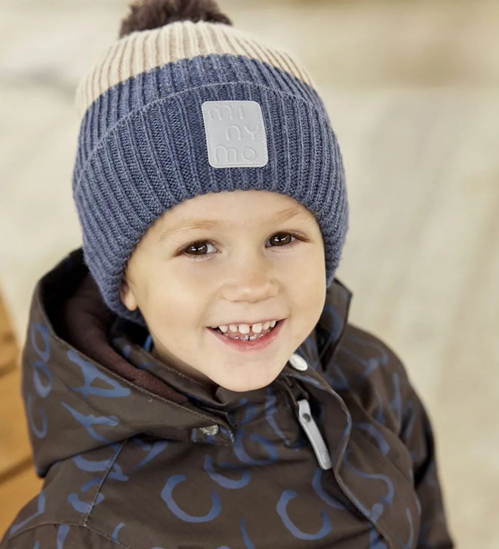 Lækker Minymo hue i blå og beige. Huen er strikket i en flot ribstruktur og har en brun kvast på toppen.