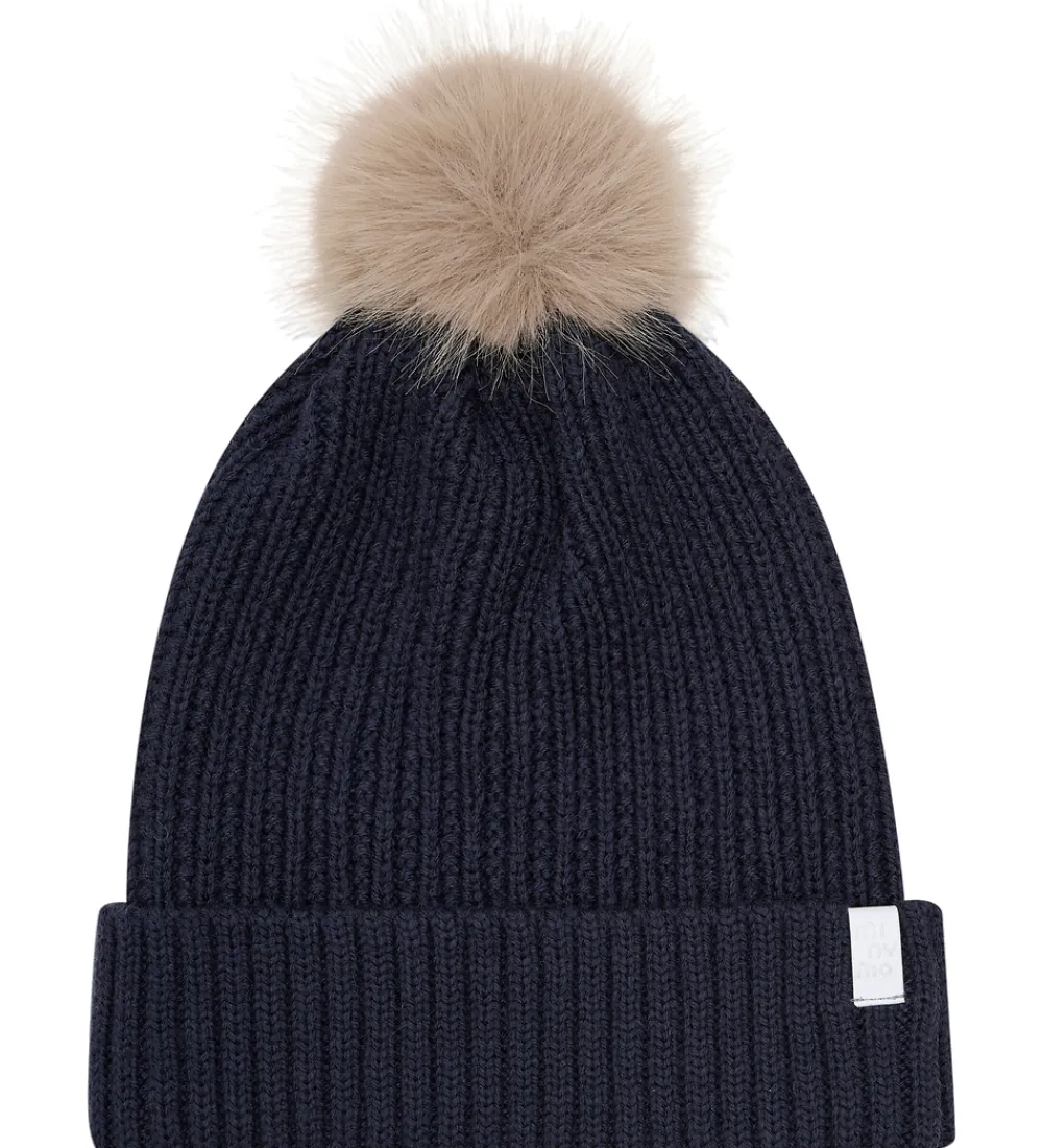 Lækker Minymo hue i navyblå. Huen er strikket i en flot struktur og har en fin, aftagelig kvast på toppen i imiteret pels.